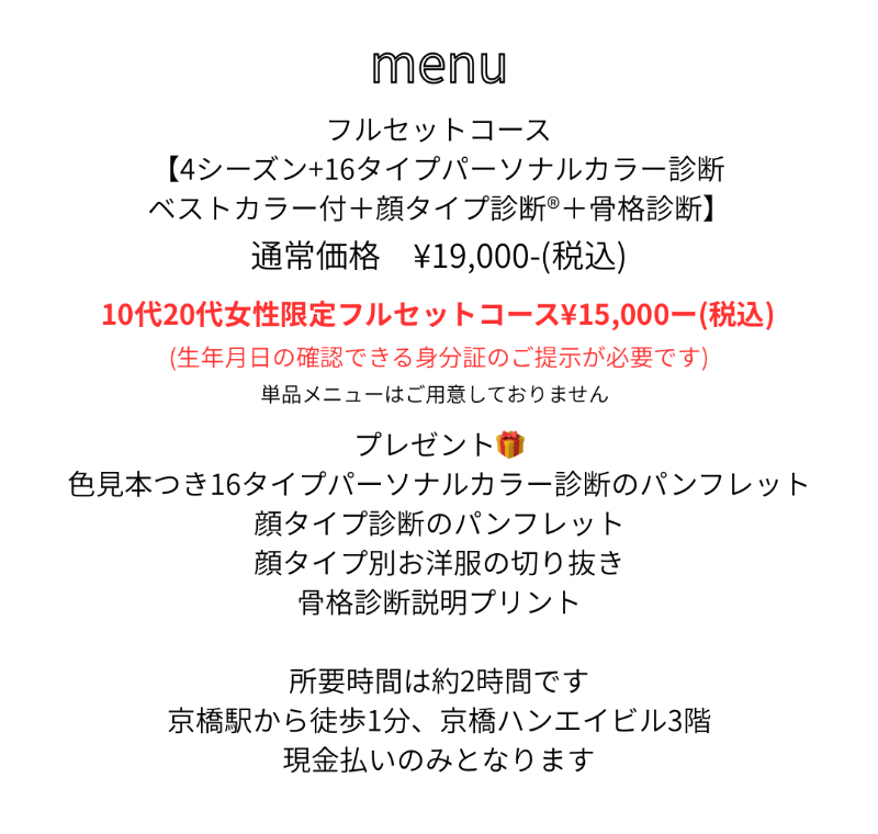 | 10代20代女性限定4シーズンパーソナルカラー診断+16タイプパーソナルカラー診断+骨格診断+顔タイプ診断®︎、フルセットコース |